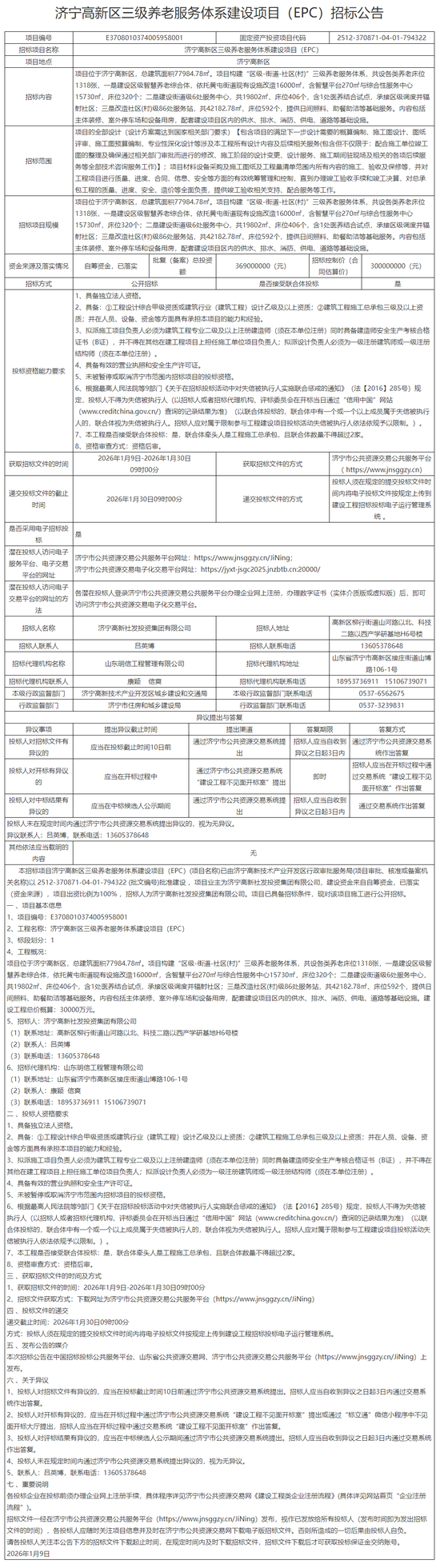 本招标项目济宁高新区三级养老服务体系建设项目(EPC)(项目名称)已由济宁高新技术产业开发区行政审批服务局(项目审批、核准或备案机关名称)以 2512-370871-04-01-794322 (批文编号)批准建设 ,项目业主为济宁高新社发投资集团有限公司,建设资金来自自筹资金,已落实(资金来源),项目出资比例为100% ,招标人为济宁高新社发投资集团有限公司。项目已具备招标条件,现对该项目施工进行公开招标。