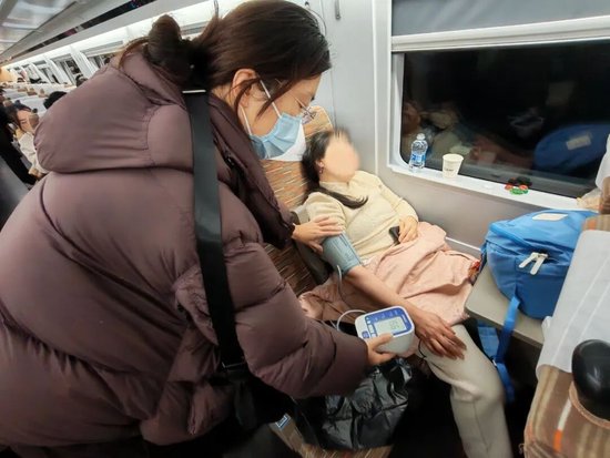 情况紧急,她当即建议患者立刻下车就医,并联系120急救。但患者因个人原因,坚持要到下一站下车,由家属陪同前往医院。为保障患者安全,该医生选择全程陪同,耐心叮嘱患者保持平卧休息、避免情绪激动。列车到站后,她协助联系轮椅转运,亲自将患者安全交到家属手中,还详细告知了途中的检查情况和注意事项,完成了细致的交接工作。忙完这一切,已是深夜,她才踏上辗转回家的旅程。