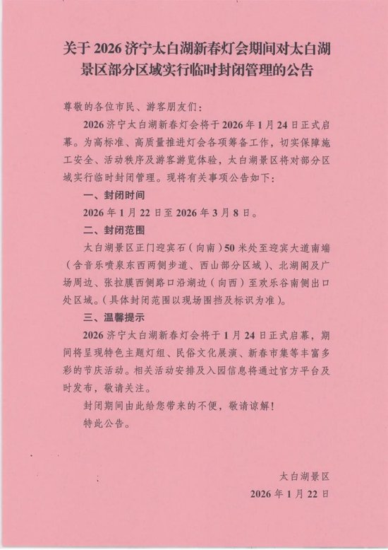 关于2026济宁太白湖新春灯会期间对太白湖景区部分区域实行临时封闭管理的公告