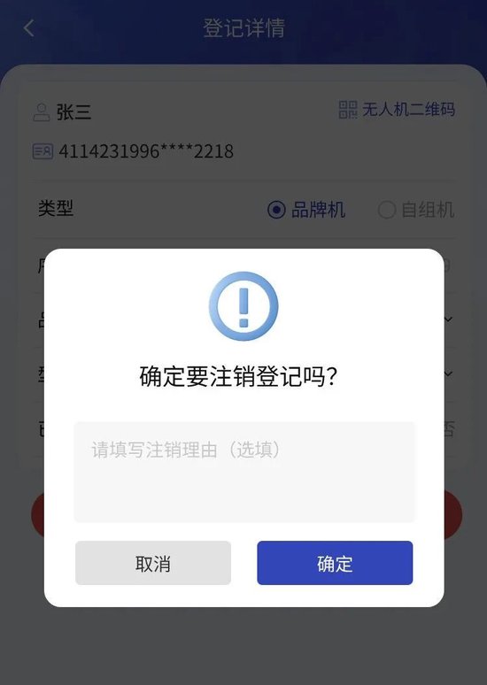 无人机登记详情页面中,用户点击底部“注销登记”按钮,填写无人机注销登记理由,可完成无人机注销。