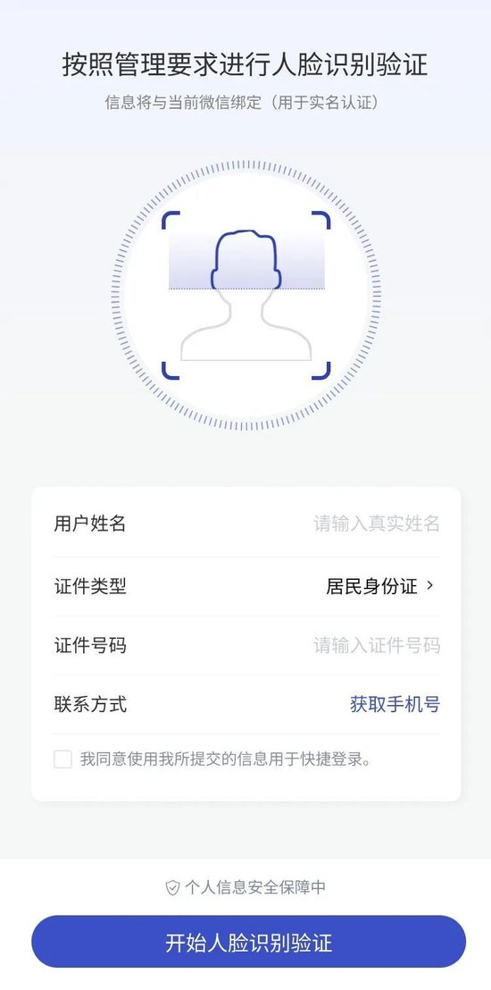 用户首次进入小程序须进行实名认证,按照屏幕提示输入姓名、证件号码、联系方式、验证手机号码并点击“开始人脸识别验证”进行人脸核验身份。用户完成实名认证后,微信小程序账号将会与个人信息绑定。