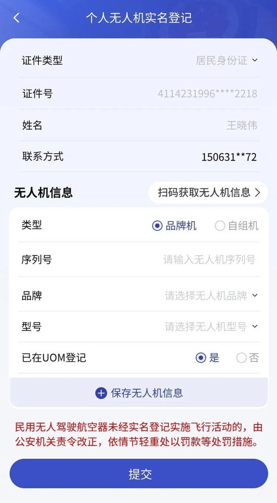 如有多架无人机则可继续按照提示填写无人机信息,每架无人机信息填写完毕后都需点击“保存无人机信息”按钮,将无人机信息保存。所有信息填写完毕后点击“提交”按钮,即可完成个人无人机信息登记。