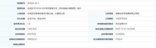土地位于:任城区观音阁街道深圳路以南、水景路以西;土地面积:14429㎡(约22亩);土地用途:城镇住宅用地兼容商业用地;出让年限:住宅70年、商业40年;容积率不大于1.6;起始价:6707万元,综合楼面价起价:2905元/㎡;最终成交价为:6707万元(约305万元/亩),综合楼面地价成交价:2905元/㎡;溢价率:0.0%;