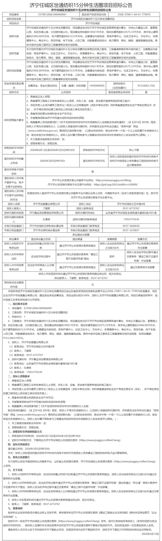 本招标项目济宁任城区世通纺织十五分钟生活圈项目已由山东省投资项目在线审批监管平台以2508-370811-04-01-779076批准建设,项目业主为济宁市创展置业有限公司,建设资金来自自筹资金,项目出资比例为100%,招标人为济宁市创展置业有限公司。项目已具备招标条件,现对该施工总承包项目进行公开招标。