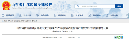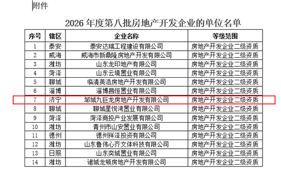 近日,根据《关于修改<房地产开发企业资质管理规定>的决定》(住房和城乡建设部令第54号)及有关实施要求,山东省住房和城乡建设厅对2026年度第七批房地产开发企业资质的审查意见进行了公示,现将核准的名单予以公告。