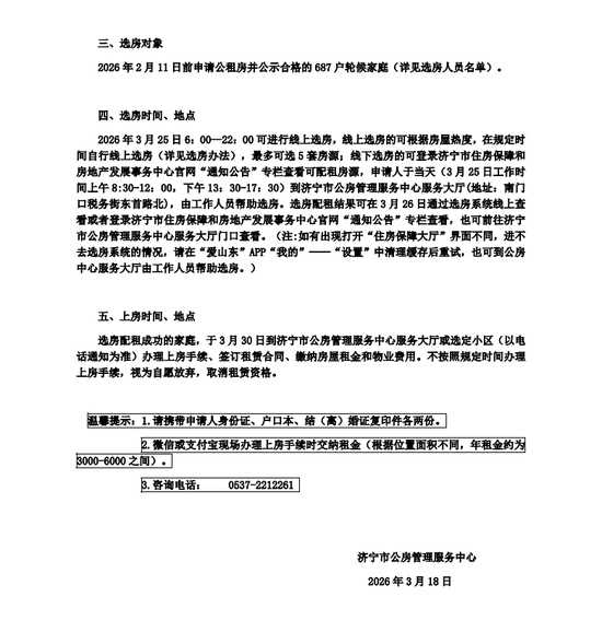 近日,济宁市住房保障和房地产发展事务中心发布济宁市主城区公共租赁住房选房告知书及2026年3月25日批次公租房选房房源。涉及济宁市主城区17个小区397套房源,详情如下。