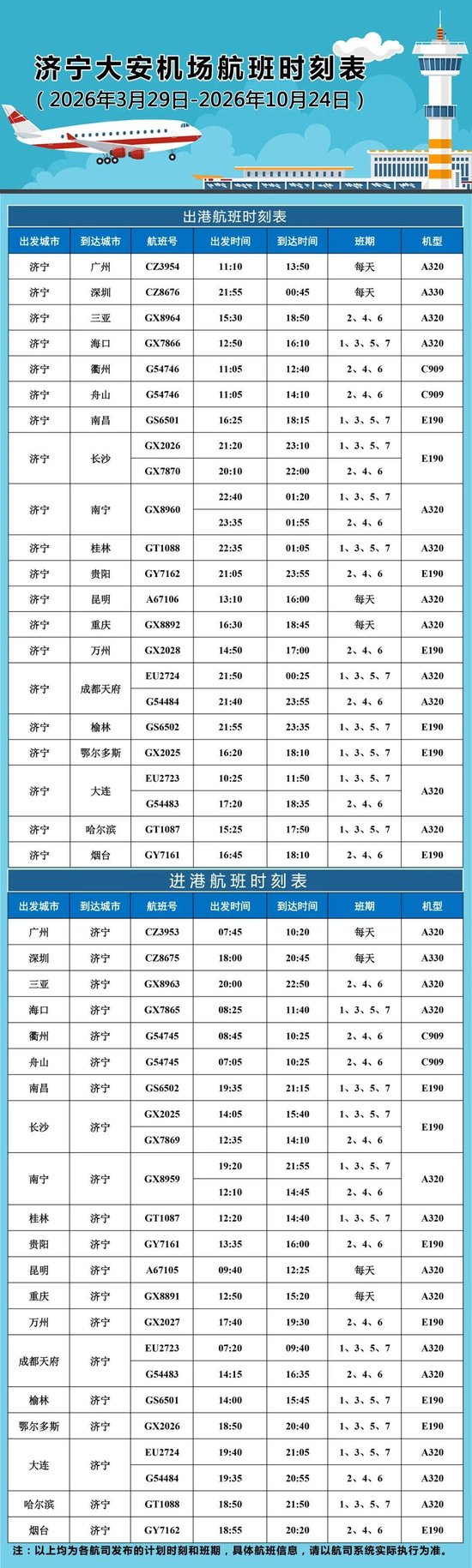 3月29日起,济宁大安机场将执行2026年夏秋航季航班计划。