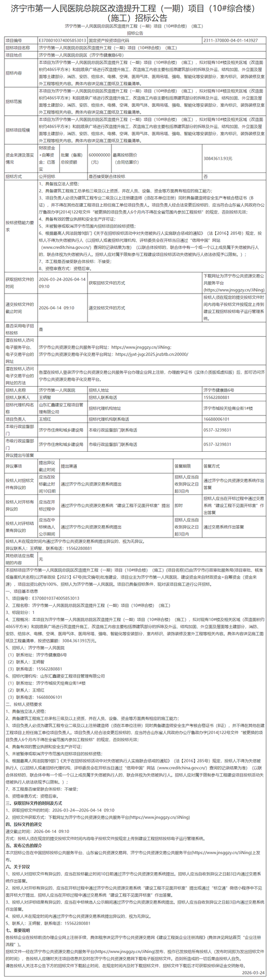 工程概况:本项目为济宁市第一人民医院总院区改造提升工程(一期)项目(10#综合楼)(施工),拟对现有10#楼及相关区域(改造面积约4865平方米)和院喷泉广场进行改造提升施工,改造施工内容主要包括原建筑部分的拆除及外运、结构加固、外立面及屋面等土建部分,消防、安防、给排水、电梯、空调、医用气体、医用吊塔、强电、智能化等安装部分,室内标识、装饰装修及室外工程等相关内容。具体内容详见施工图纸及工程量清单,投资估算额:3084.361393万元。