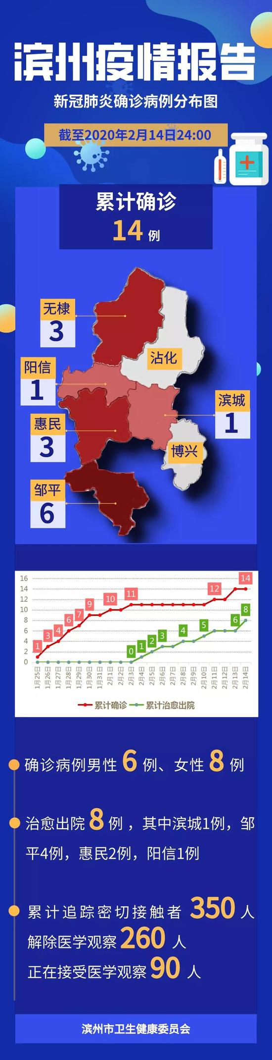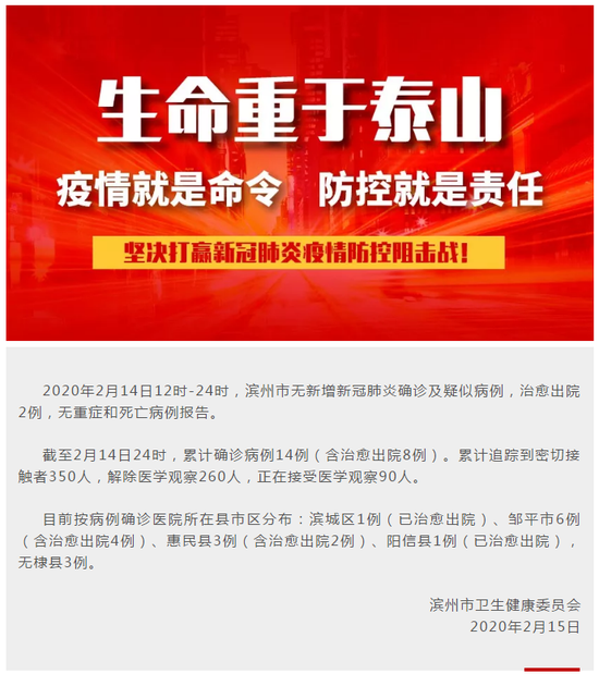 2020年2月14日12时-24时,滨州市无新增新冠肺炎确诊病例,治愈出院2例