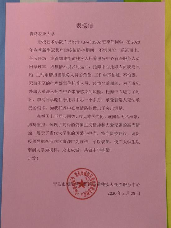 关注3月25日,青岛农业大学艺术学院收到青岛市城阳区惜福镇街道残疾人托养中心发来的感谢信,对学院产品设计(3+4)1901班李润同学疫情期间在托养中心一个多月照顾托养人员的行为表示感谢。
