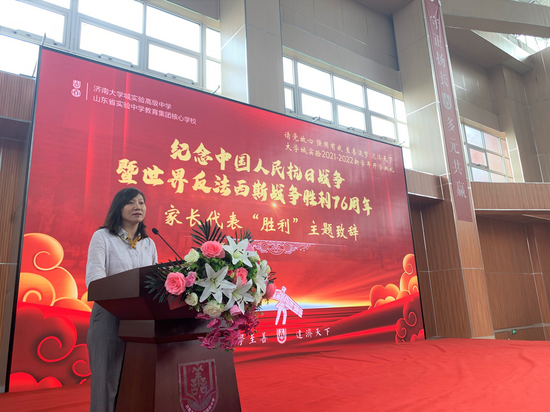 家长代表李群发言,与师生分享作为家长将乘着学校首届毕业生辉煌毕业成果的东风,家校合育,再争取新的更大胜利。