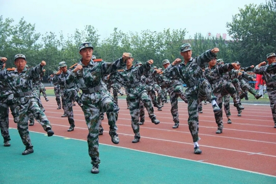 军体拳表演方阵闪亮登场,他们步伐稳健、整齐划一,动作干净利落,气势如虹、虎虎生威。“嘿”、“哈”、“杀”,高亢的口号,震天动地,瞬间点燃了全场的激情。