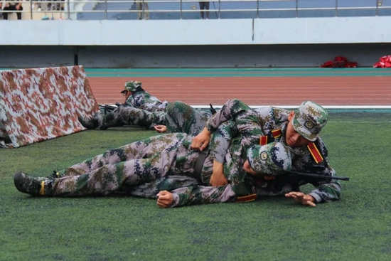 随后汇演进入到综合演练环节——“战场救护”,场上响起模拟枪炮的声音,所有人瞬间如置身真实的战场。演练新生端枪瞄准、搜索前进、医疗救护、头部包扎、腿部包扎、担架抢救,动作如行云流水一气呵成,精彩的表演赢得阵阵掌声。