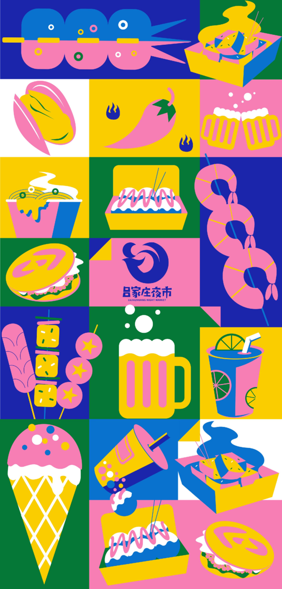 吕家庄夜市将重装焕新——城阳区城阳街道委托‘西乘恩文化’就城阳街道夜经济实施重新定位打造。从‘吕家庄夜市’整体VI视觉策划、品牌logo策划设计、文旅IP开发设计、mini博物馆打造到街区动线的策划设计、导视系统规范以及局部摊位平面视觉升级等,再到后续的系列主题活动的策划实施,强化和细化大众对吕家庄夜市“潮流”、“时尚”,热气腾腾的人间烟火气的印象。同时,这也是继夜市实现促进经济发展、保障民生之余,深入挖掘吕家庄的社区文化,将其历史资源与当下优势提炼升华,为其量身打造出个性化的文旅IP。