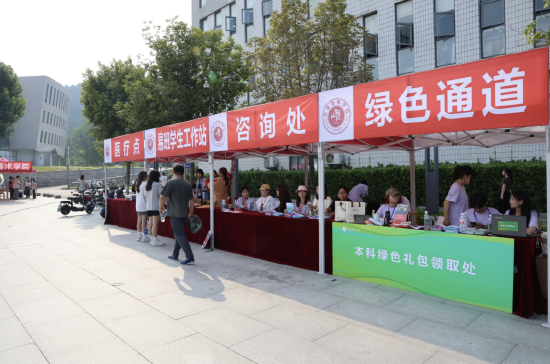 在校友广场上,学生资助管理中心暖心护航家庭经济困难学生顺利入学,特别设立了“绿色通道”,为助学贷款学生现场发放“爱心礼盒”和“爱心礼包”,使家庭经济困难学生在入学之初就感受到温度和关怀,护航他们开启精彩的大学旅程。心理健康教育中心现场为新生们发放了量身定做、精心设计了《萌新入学心理适应》和《心理咨询服务》手册,助力新生尽快适应大学生活。