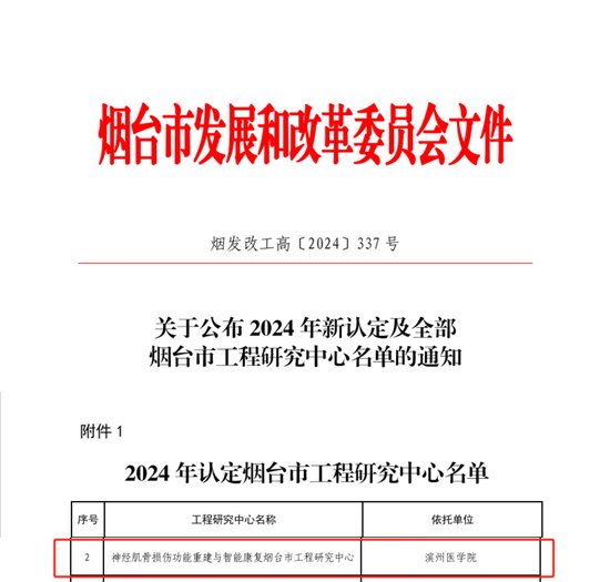 关注日前,烟台市发展和改革委员会印发《关于公布2024年新认定及全部烟台市工程研究中心名单的通知》,滨州医学院特殊教育与康复学院申报的“神经肌骨损伤功能重建与智能康复烟台市工程研究中心”成功获批。