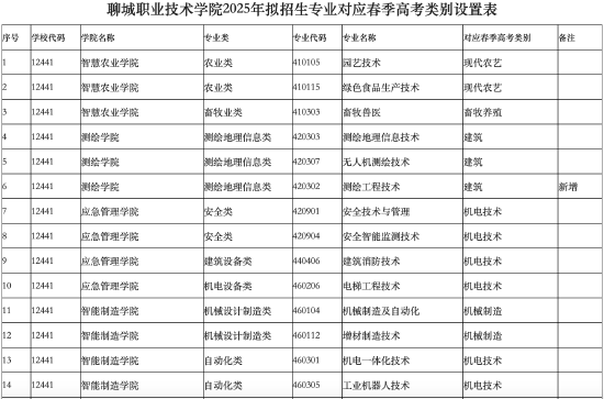 聊城职业技术学院2025年拟招生专业对应春季高考类别设置表发布