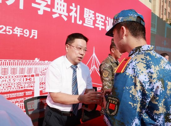 黄飞发表题为《执仁心妙术之笔,绘青春报国之卷》的讲话,代表学校对2025级新同学表示热烈欢迎。他深情回顾了学校高点起步,从西迁黄河岸到东进黄海畔的峥嵘岁月,阐析了“滨医人”所承载的历史底蕴、校训精神和神圣使命。他勉励同学们要筑牢信仰之基,在时代浪潮中把稳方向。要主动了解国情民情,关注医疗卫生事业发展,在为人民健康服务的不懈奋斗中书写绚烂的青春篇章;要磨砺卓越之能,在知行合一中增强本领。要永葆求知热情和探索勇气,弘扬追求真理、严谨治学科学家精神,珍惜机遇、勤于实践,在身体力行中求真学问、练真本领、增真才干。要涵养仁爱之德,在坚守初心中行稳致远。要铭记“健康所系,性命相托”的誓言,自觉培养人文关怀,坚守学术道德,以实际行动践行“仁心妙术”校训,努力成长为医术精湛、医德高尚的卓越医学人才。他强调,军训是大学第一课,希望同学们服从指挥、刻苦训练,以严明的纪律、优良的作风和坚韧的品格,交出一份精彩圆满的军训答卷,为大学生活开好头、起好步。