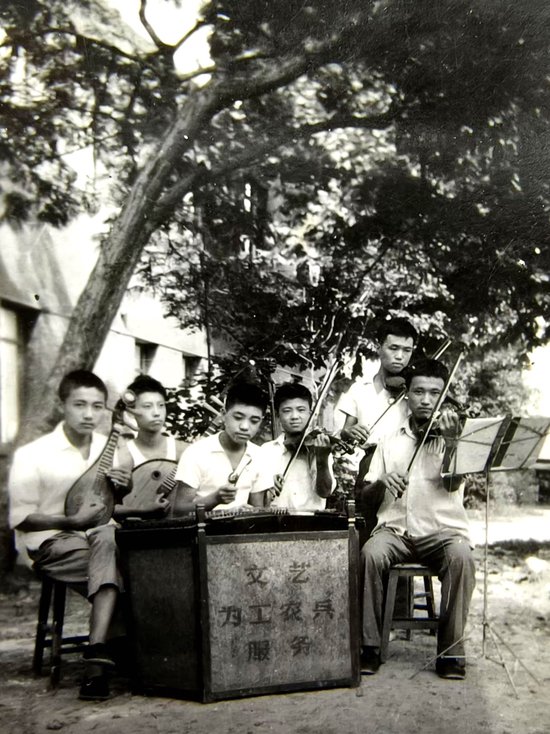 1967年,王力一凭借优异成绩考入济铁一中,成为初一新生。凭借自己的音乐天赋,他迅速融入学校文艺宣传队,并成为其中的核心骨干。在《长征组歌》的晨练中磨砺意志,于《红色娘子军》的排练厅里淬炼品格。身为小提琴手,他引领队友以琴弦奏响时代的激昂强音,用舞步丈量革命的坚定信仰。1969年深秋,梧桐叶间飘落的油印乐谱,记录着他与队友们“文艺为工农兵服务”的铿锵誓言。当原济南军区前卫文工团特招入伍的通知送达学校时,这位15岁的少年毅然决然地选择携琴从戎,在渐次褪色的校园幕布前,留下“艺苑从戎”的青春壮丽剪影。