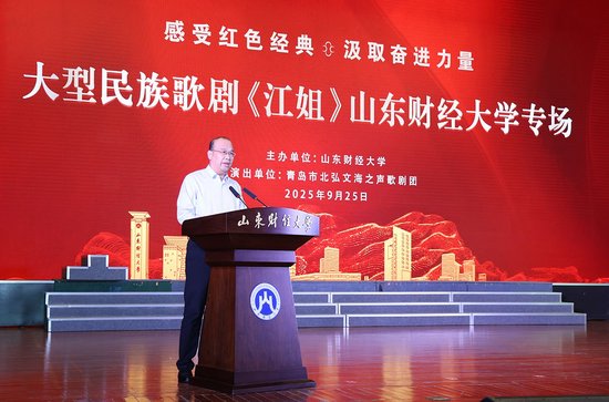 演出开始前,张培国致辞。他代表学校向出席活动的领导、来宾及媒体记者表示热烈欢迎和衷心感谢,表示在举国上下隆重纪念中国人民抗日战争暨世界反法西斯战争胜利80周年、喜迎新中国成立76周年华诞之际,民族歌剧《江姐》走进山东财经大学,可谓恰逢其时、意义重大。张培国简要介绍了学校的基本情况。他表示,学校自第二次党代会召开以来,高度重视挖掘红色历史文化资源,丰富完善红色文化的思想教育体系,打造红色文化传承的“财大样板”,着力培养德智体美劳全面发展的“时代新人”。红色经典具有历久弥新的生命力和跨越时空的穿透力。红色经典走进校园,与思政育人深度结合,不仅是对历史的重温回望,更是对红色血脉的传承弘扬。他指出,此次歌剧《江姐》来校专场演出,对广大师生特别是青年学生来说,是一场精彩纷呈的视听盛宴,一堂别开生面的思政大课、更是一次触及灵魂的精神洗礼。