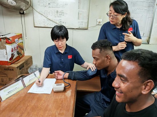 队长刘秀与队员曲天一、连慧秀、秦昌盛,在上海开创远洋渔业有限公司于义荣经理的陪同下,乘坐半小时小艇驶向锚地。他们身着救生衣,迎风破浪,登船为全体船员开展了温暖而专业的义诊服务。医疗队首先为29名中国籍船员和4名基里巴斯籍船员进行了健康体检并逐一建立健康档案。队员们分工协作、默契配合,连慧秀负责检测体温及记录血糖、血压数据,刘秀专注血压测量;曲天一负责血糖检测,秦昌盛则执行体格检查与心肺听诊。针对检查出患有高血压和高血糖的船员,医疗队员从生活方式调整、体重控制和规范用药三方面给予建议和指导。