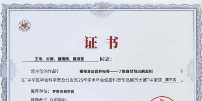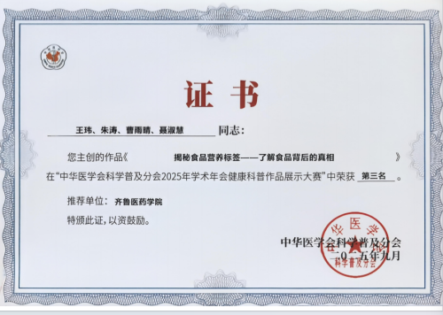 会议期间,备受关注的医学科普创作大赛评选结果正式揭晓。本次大赛分图文作品、视频作品、路演三个赛道,经过初筛与专家现场评比,在全国上千余件作品中,齐鲁医药学院王玮老师团队创作的作品《揭秘食品营养标签——了解食品背后的真相》荣获第三名,充分展现了学校在医学科普领域的科研实力。