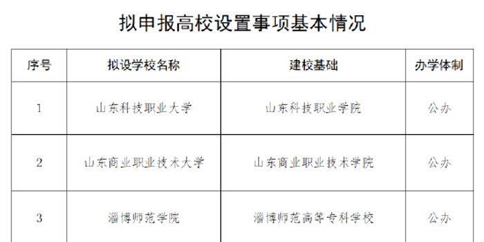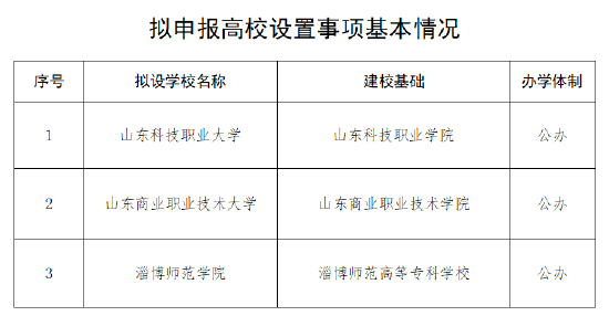 根据《中华人民共和国高等教育法》《中华人民共和国职业教育法》《普通本科高校设置暂行规定》《本科层次职业学校设置标准(试行)》《山东省高等职业学校设置暂行办法》等法律法规和有关政策规定,现对拟申报的3个高校设置事项予以公示。