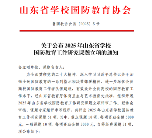 关注日前,2025年山东省学校国防教育工作研究课题立项名单公布,齐鲁医药学院王杰老师主持申报的《新时代背景下高校朋辈教育在参军动员中的创新模式研究》获批立项。