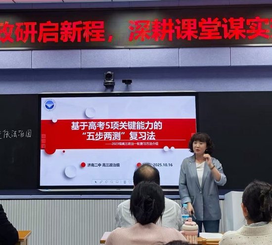 随后,济南二中高三政治备课组长马琳娜立足本校学情,介绍了该校在高三复习中的特色做法与成效,引发热烈交流。