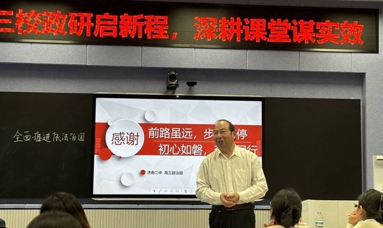 10月16日,济钢高中、济南一中、济南二中跨校“教研共同体”成立大会暨济南二中“校庆月展示课”启动仪式顺利举行。启动仪式后,政治教研组开展第一次联合教研活动。活动中,济南一中王晓安老师执教高三复习专题课《全面依法治国》,结合教学实践系统分享了济南一中高三政治学科的复习思路、方法策略与备考经验,为参会教师提供了可借鉴的教学范例。