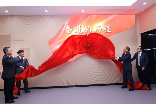 在热烈的掌声下,查玉喜、洪俊杰、张体勤、姜宗俊共同为办学成就展揭幕,并与校友代表合影留念。