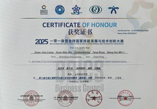 关注9月27日,2025“一带一路”暨金砖国家技能发展与技术创新大赛第三届交通土建数字化施工技术应用竞赛全国总决赛在哈尔滨铁道职业技术学院圆满闭幕。山东职业学院教师唐荣、王慧敏指导的段京良、管文滨荣获高职组全国总决赛三等奖。
