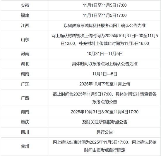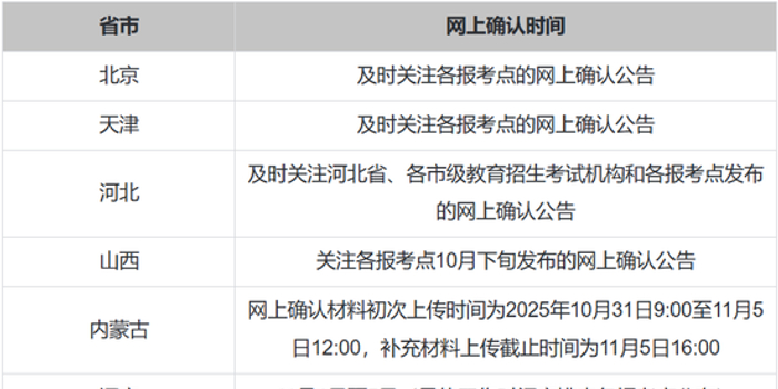 山东省网上确认材料初次上传时间为2025年10月31日9:00至11月5日12:00。补充材料上传截止时间为11月5日16:00。逾期不能上传。山东所有报考点均采用网上确认方式,请考生认真阅读所选报考点发布的网报公告,按报考点要求及时准确上传相关材料,完成网上确认。