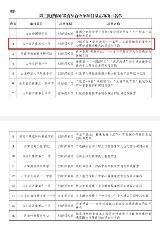 关注日前,济南市教育局公布第三批教育综合改革项目立项结果,济南三中申报的《心育探微・智启未来 —— 基于人工智能辅助的高中生心理健康教育模式的探索与实践》项目成功获批。这既是对学校在心理健康教育与技术融合领域探索成效的高度认可,更是对学校持续推进育人方式创新、深耕学生心理健康工作的充分肯定。