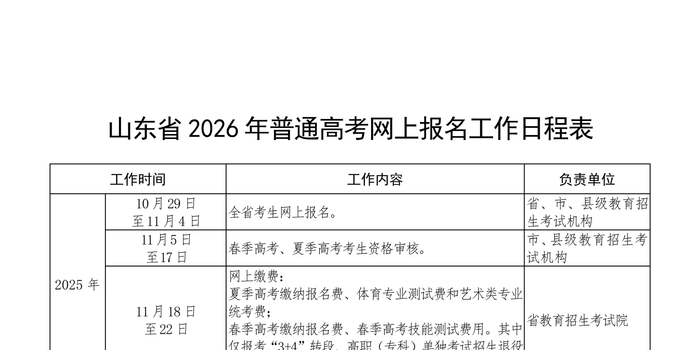 山东省2026年普通高考网上报名工作日程表