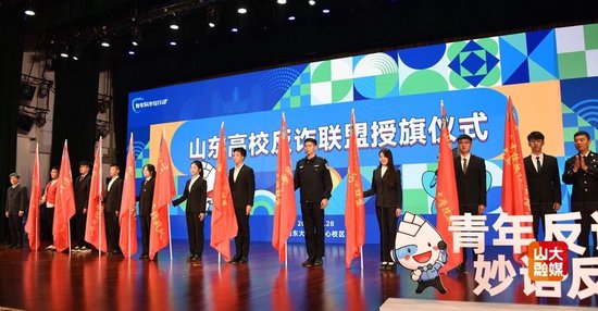 李文生、山东省公安厅刑事侦查总队副总队长刘春茂共同为10所高校组成的反诈联盟授旗。
