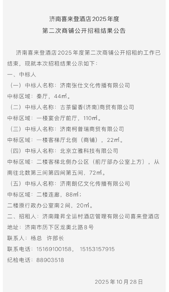 济南喜来登酒店2025年度第二次商铺公开招租结果公告