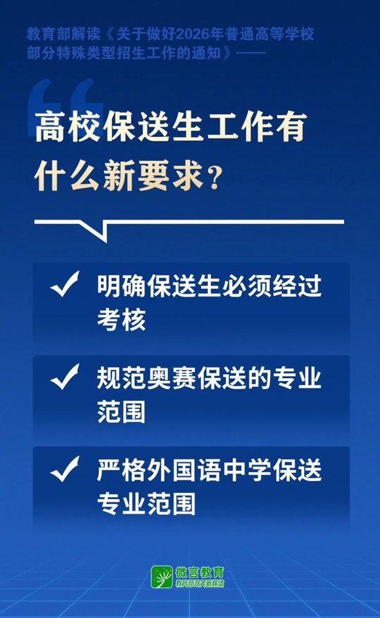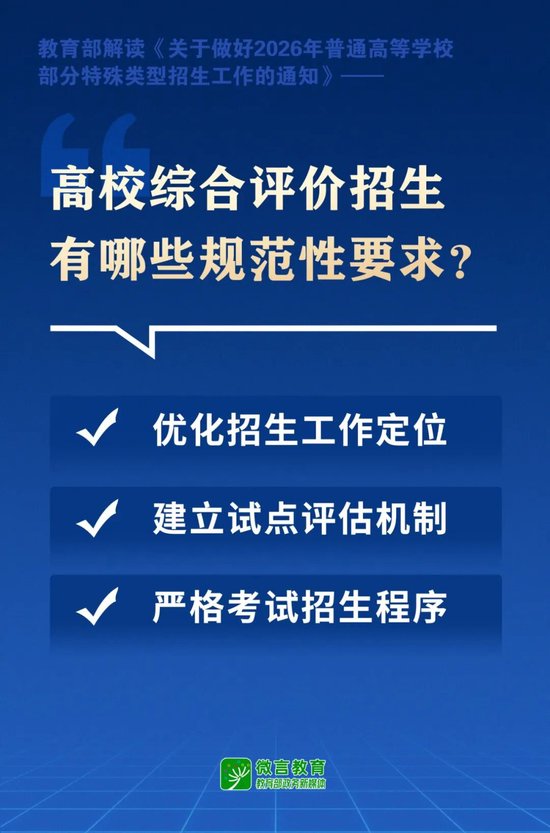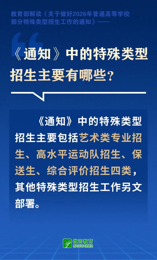 关注日前,教育部印发《关于做好2026年普通高等学校部分特殊类型招生工作的通知》(以下简称《通知》)。特殊类型招生主要有哪些?又有哪些新要求?一起来看——