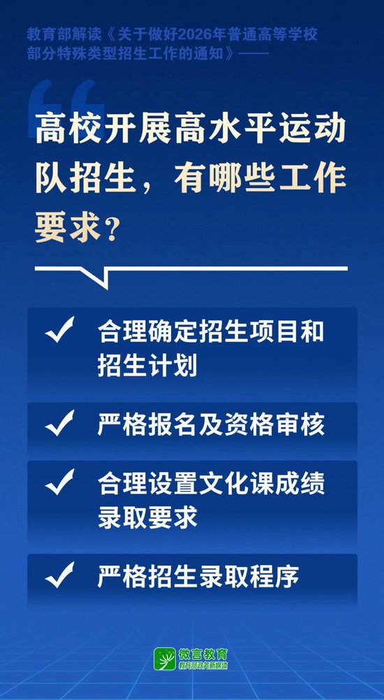 二是严格报名及资格审核。2026年,符合生源省份高考报名条件,获得国家一级运动员(含)以上技术等级称号者可报考相关高校高水平运动队招生。2027年起,获得国家一级运动员(含)以上技术等级称号且近三年在体育总局、教育部规定的全国性比赛中获得前八名者方可报考。高校要加强考生报考资格审核,重点加强对考生运动员技术等级证书的核验。