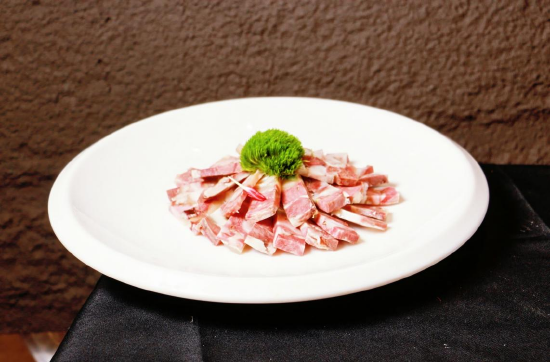 冷猪肉:他大胆借鉴传统名菜“羊垛子”的制作工艺,将整只猪头精细处理,配以三十余种香料,经慢火长时间炖煮至骨酥肉烂。随后拆骨取肉,层层叠压,再运用特制的压缩机进行塑形定态。这一创新工序,不仅有效去除了多余油脂,使成品口感软糯Q弹、咸香醇厚,更赋予其方正雅致、肌理分明的视觉美感,实现了味觉与视觉的双重提升。