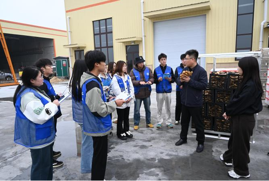 服务队首站抵达安丘市斧创集团,实地参观其生姜恒温储藏库、初加工车间及出口分拣流程。队员们通过现场查看、与企业负责人交流,重点了解企业在生姜采收后的预冷处理、恒温储藏、分级包装及出口销售等环节的实际操作与现存问题。结合冷链与供应链专业知识,志愿者们围绕如何提升储藏稳定性、降低损耗率、优化出口流通效率等方面与企业展开交流,为后续整合企业资源、推动冷链服务下沉积累了基础信息。