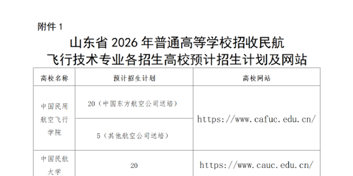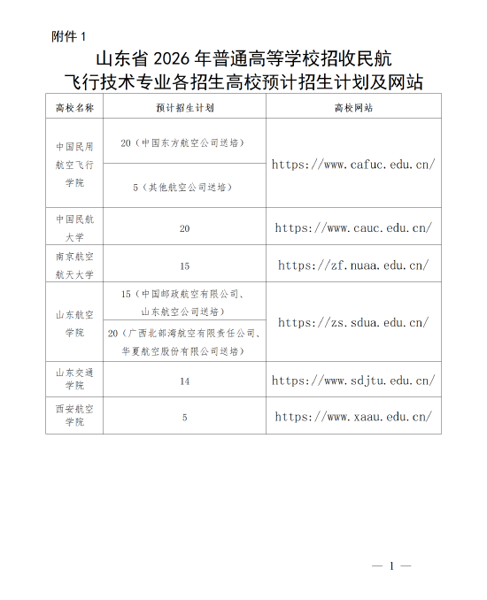 1、山东省2026年普通高等学校招收民航飞行技术专业各招生高校预计招生计划及网站
