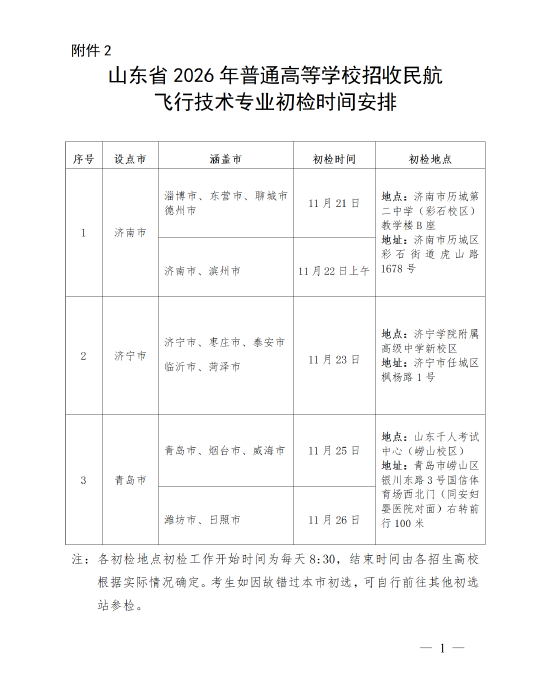2、山东省2026年普通高等学校招收民航飞行技术专业初检时间安排