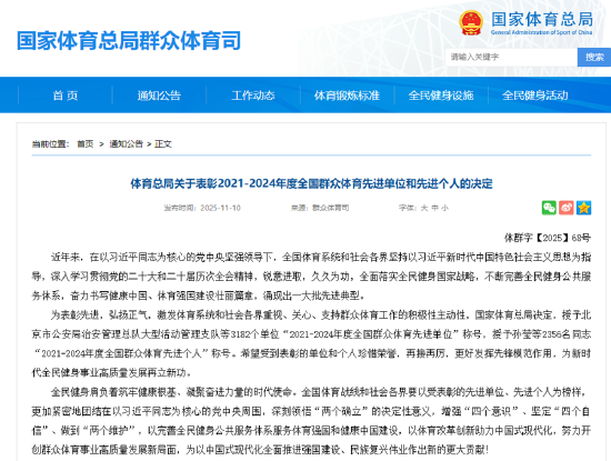 关注11月10日,国家体育总局正式发布《体育总局关于表彰2021-2024年度全国群众体育先进单位和先进个人的决定》,对在全国群众体育工作中做出突出贡献的单位和个人予以表彰。山东外国语职业技术大学凭借在群众体育工作中的卓越表现和丰硕成果,成功获评“全国群众体育先进单位”这一国家级崇高荣誉。