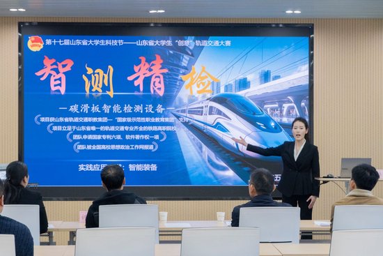 本次大赛以“以科技创新星星之火,点亮青春逐梦路”为主题,吸引了来自山东大学、山东建筑大学等省内14所高校近800名师生报名参赛。经专家网上评审,20个项目进入现场决赛,呈现“双赛道”竞逐格局。其中,理论创新组聚焦智能化、绿色化、融合化等前沿课题;实践创新组则在轨道交通智慧运维中心完成列车障碍物AI识别、碳滑板智能巡检等实操作业。各参赛作品凸显轨道交通领域“政-校-行-企”协同创新生态圈价值创造导向,为破解“列车智能化运维”“绿色轨道交通系统构建”等产业痛点提供了青年智慧解决方案。来自中车青岛四方的中华技能大奖获得者、评审专家周勇感慨道:“今年作品的技术转化率较往届提升20%,特别是职业院校团队在场景落地方面表现突出。”