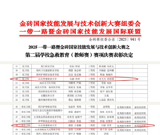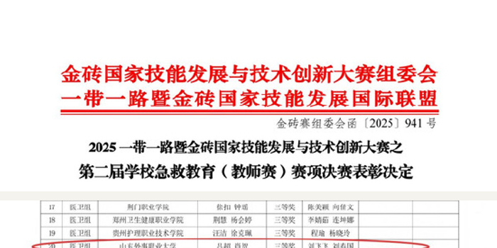 关注11月18日,2025年“一带一路”暨金砖国家技能发展与技术创新大赛(以下简称“金砖大赛”)公布第二届学校急救教育(教师赛)决赛结果,山东外事职业大学获评“优秀组织奖”。医护学院教师团队成绩出色,充分展现了学校在急救教育领域的教学实力与专业水平。