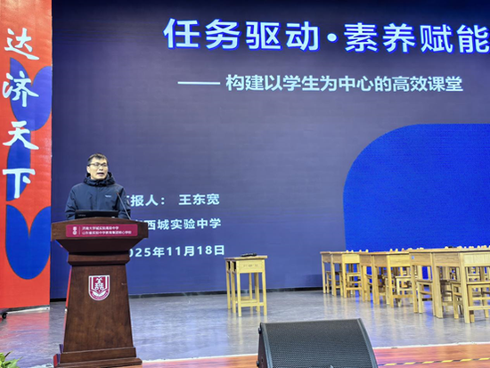 在专题报告环节,济南西城实验中学秦梦茵老师作《筑基·贯通·突破——三阶融合的创新培养体系》主题报告,结合多年高三教学实践经验,分享了学校在拔尖创新人才培养课程体系与机制建设方面的整体规划和一系列提升复习效率的务实策略。济南西城实验中学学科主任王东宽则以《任务驱动,素养赋能》为题,系统阐释了如何构建以学生为中心的高效课堂,引发与会教师的广泛共鸣。