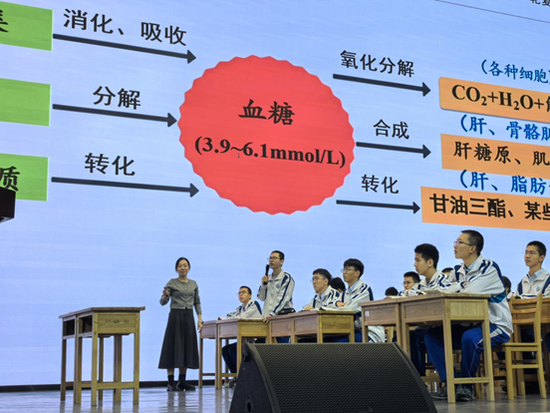 课例研讨以两节体现“大单元教学”理念的复习课为主线。济南大学城实验高级中学付晓静老师执教《血糖稳态:机体精密的调控之旅》,以“血糖浓度变化曲线”为逻辑主线,引导学生构建“感知→分泌→作用”的调控模型,并融入“智能胰岛素”等前沿科技,实现从理论认知到科学应用的思维跨越。济南西城实验中学赵婷婷老师执教的《神经递质与激素:解码生命信号传递的调控机制》以“渐冻症”为复杂情境,引导学生在已有模型基础上,进一步构建出“信源-信道-信宿”的通用分析框架,系统阐释神经递质与激素的调控过程,将神经-体液-免疫调节网络有机融合,促进学生实现从知识整合到思维创新的能力跃升。两节课层层递进,从具体模型到一般规律,从稳态维持到病理分析,共同呈现了“大单元教学”在高三复习课中的实践路径,为学生科学思维与探究能力的系统培养提供了生动范例。