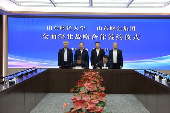 山东财经大学发展规划处处长高天云、山东财金集团总经理助理李振华,代表双方签署战略合作协议。
