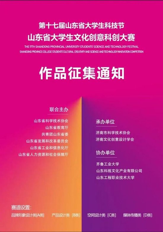作为全省极具影响力的校园科技文化品牌活动,山东省大学生科技节由山东省科学技术协会、山东省教育厅、共青团山东省委、山东省发展和改革委员会、山东省工业和信息化厅、山东省人力资源和社会保障厅联合主办。其中,山东省大学生文化创意科创大赛是面向全省高校学子的大型专业赛事,以激发大学生创新创业活力、发掘优秀文创人才、推动文创新科技深度融合为目标,为青年学子搭建起优质的创意展示与成果交流平台。赛事下设品牌形象设计[A类]、产品设计[B类]、空间设计[C类]、媒体传播[D类]四大赛道,学校传媒学院结合专业特色,精准聚焦、重点发力,组织学生参与了品牌形象设计类与媒体传播类两个赛道的激烈角逐。